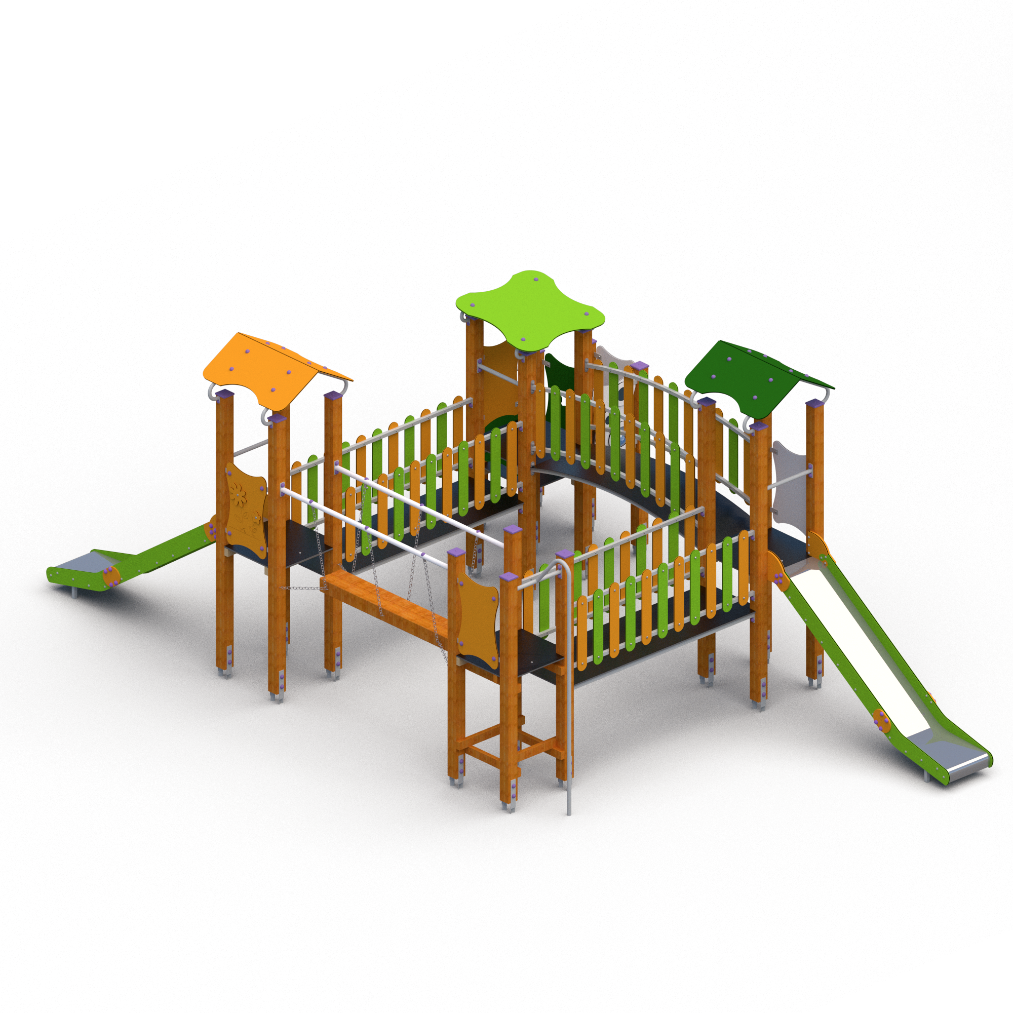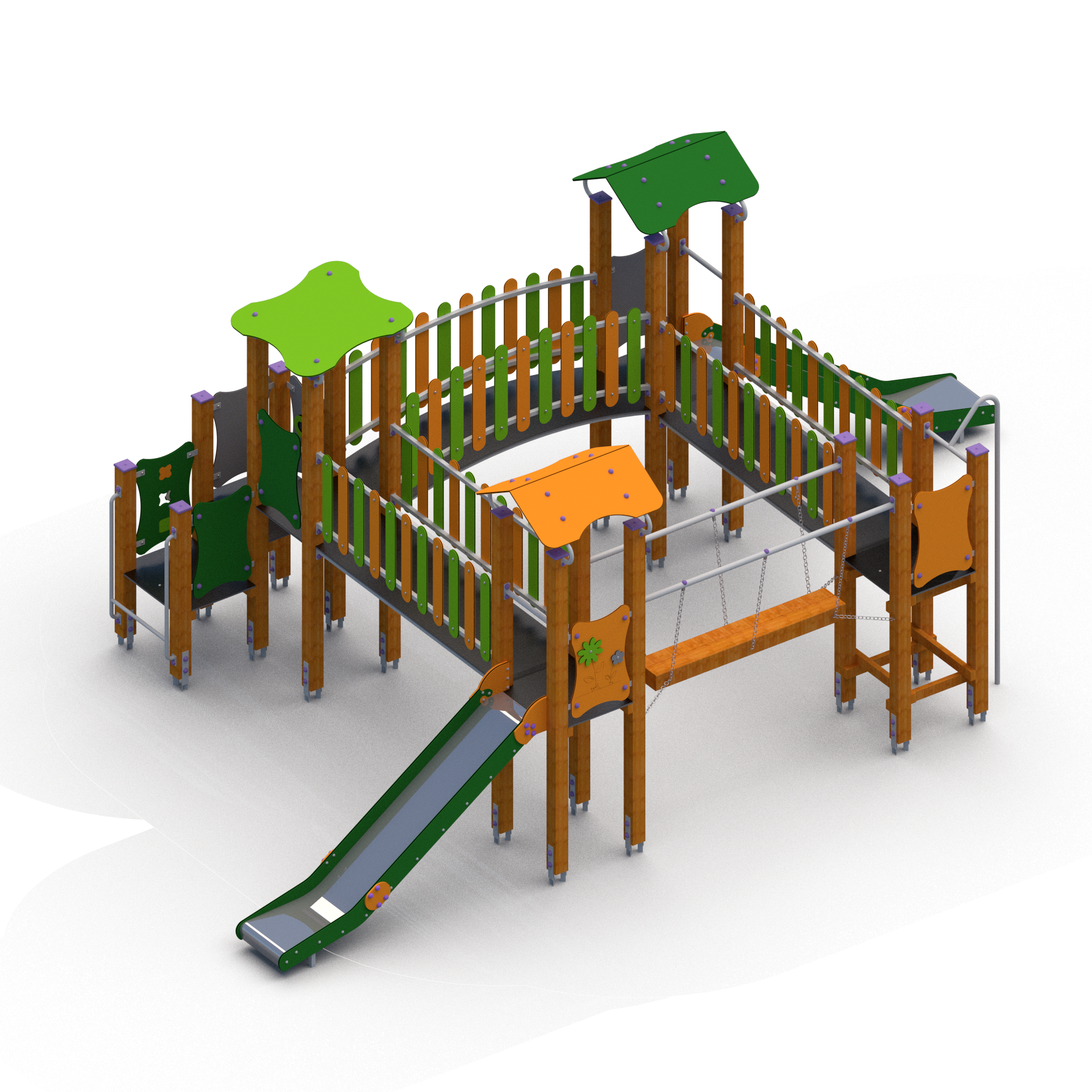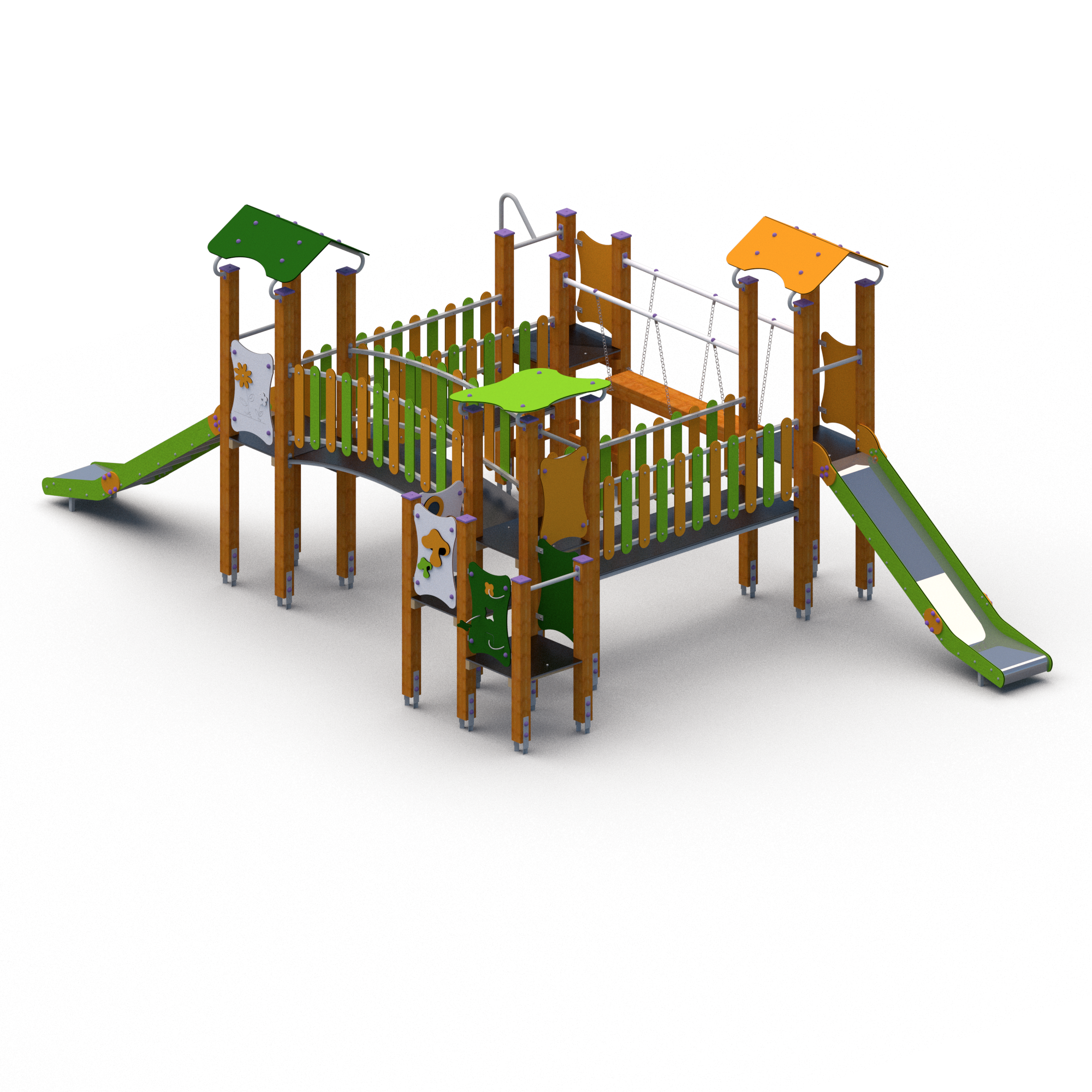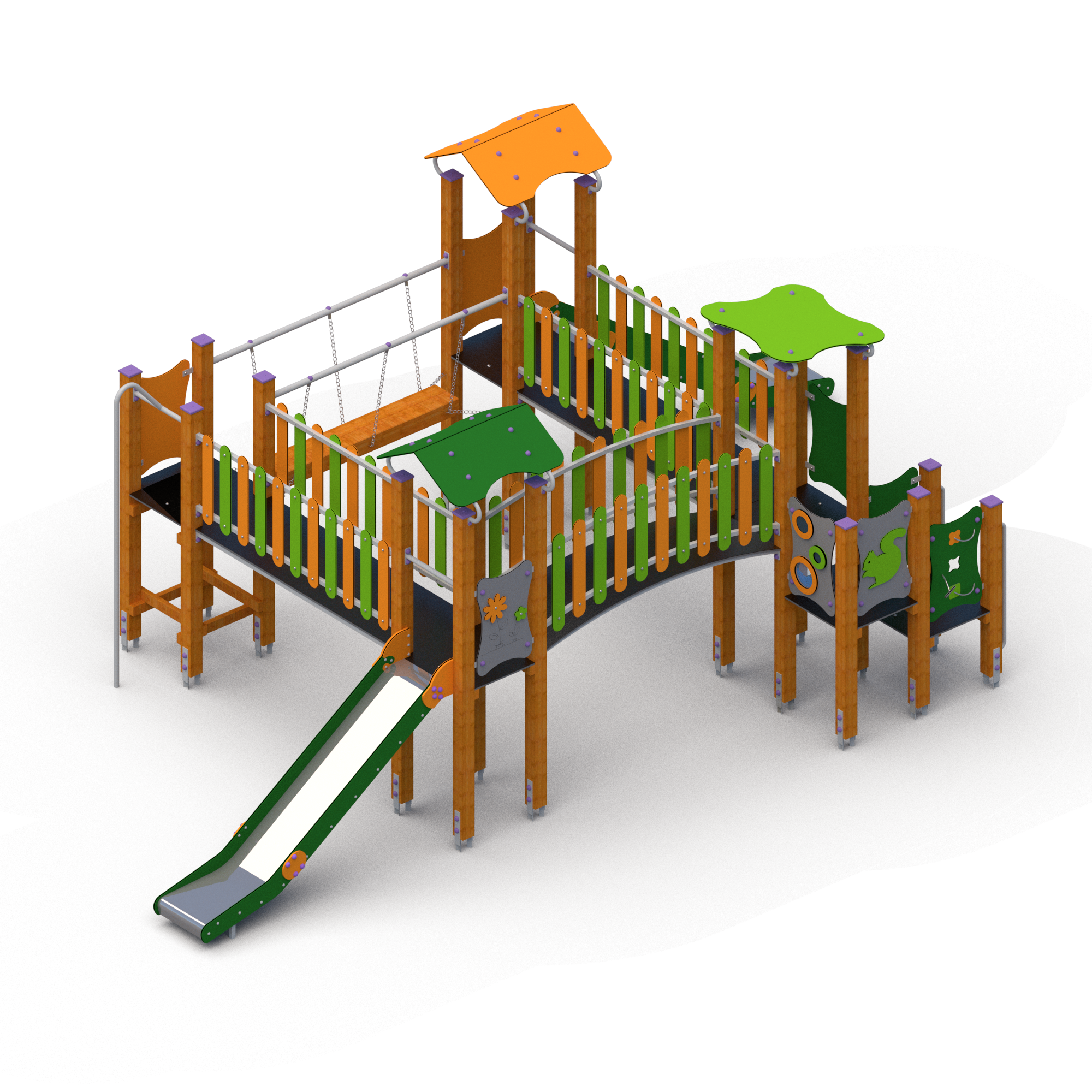 Lek och rutschställning med fyra lektorn där det finns två olika vägar att ta sig upp. Det finns två rutschar på vardera sida för att ta sig ner. Fyra olika broar sammankopplar plattformarna. Vissa utav väggpanelerna har figurer i form av djur och blommor samt små fönsterrutor så man kan kika ut.