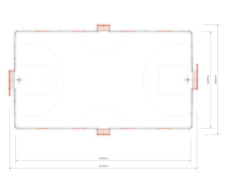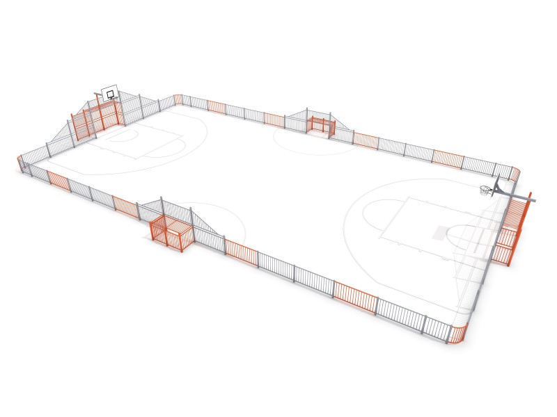 Multisportarena, som består av två stora portar, två små portar och två basketkorgar. Moduler att gjutas ner i marken.Multisportarena består av 2x stora grindar (3,00 x 2,00 m) 2x små grindar (2,00 x 1,00 m) och 2x basketkorgar