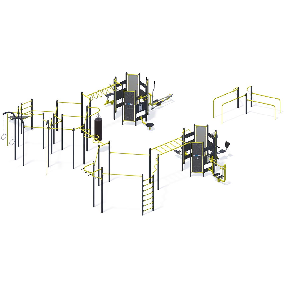 En omfattande och mångsidig anläggning som kombinerar flera träningsstationer och aktivitetszoner i ett sammanhängande koncept. Här finns möjligheter för styrketräning, klättring, armgång, balans och koordination, vilket skapar en inspirerande mötesplats för rörelse i alla åldrar. Den robusta och slitstarka konstruktionen är anpassad för parker, skolor och bostadsområden och erbjuder både hög funktionalitet och modern design.